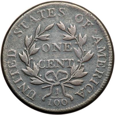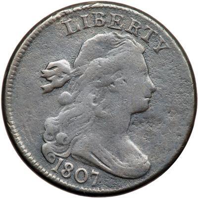 1807 S-276 R1 Large Fraction. Good-6. Reverse rotated 75 degrees CW. Sharpness VG10 with finely granular surfaces that have been lightly smoothed. No verdigris or contact marks, a shallow pitmark at the top of the L the best identifying defect. Slightly glossy dark steel brown and chocolate. E-MDS, Breen state II. Evidence of crumbling shows in the dentils over IBER, but there is no hint of swelling in the field left of the lowest curl. DWH #2362.