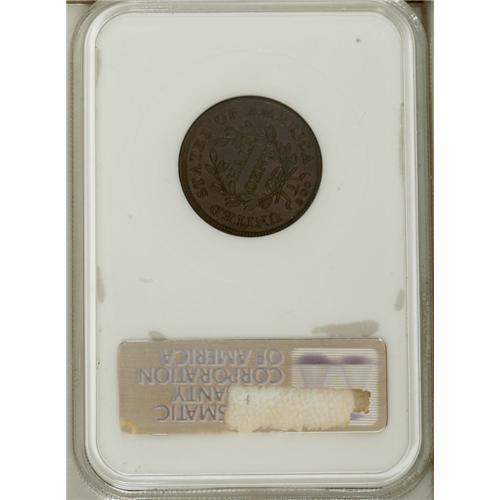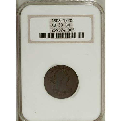<B>1808<1/2 C> AU50 NGC.</B></I> C-3, B-3, R.1. Die state 2 with light rust marks in the obverse fields. This is an attractive example of the 1808 Normal Date variety. The reverse is rotated about 60 degrees counterclockwise. Many different rotations are known for this variety as one of the dies was apparently loose in the press and turned at random as coins were struck. Smooth surfaces with intermingled olive and darker steel color. EAC 40.