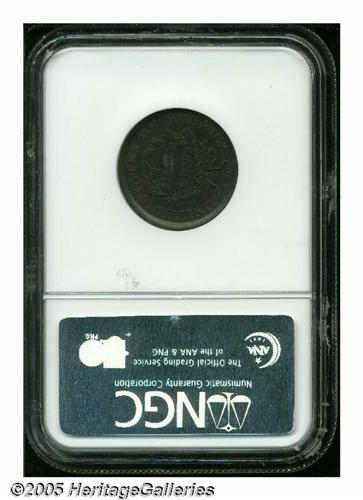 <B>1808<1/2 C> AU58 NGC.</B></I> B-3, C-3, R.1. Typically struck with uniform steel-brown surfaces that are a shade or two deeper on the reverse. The dies are rotated about 40 degrees counterclockwise.