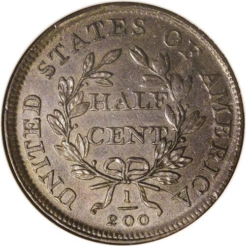 <B>1808 1/2 C AU58 NGC.</B></I> C-3, B-3, R.1. The second 8 in the date is formed by two impressions of the 0 punch normally used within the fraction denominator. This in turn implies that the die engraver lacked a suitable 8 punch, and that the working die already possessed the 180 in the date when it was removed from storage. This satiny ebony-brown half cent is well struck except for an upper right portion of the wreath, which has a faint spot and an associated cluster of minor abrasions. In an older NGC holder. Census: 10 in 58, 1 finer (4/07). EAC 35.<BR><BR><b>Shipping:</b> Coins & Currency (<a target="_blank" href="http://www.heritageauctions.com/common/shipping.php">view shipping information</a>)