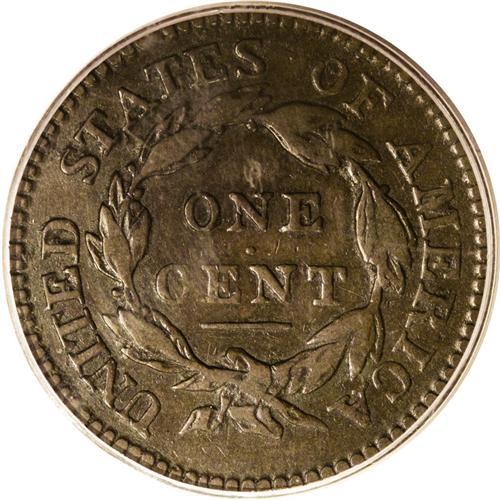 <B>(1808-1839)<1C> Large Cent--Full First Strike Reverse Brockage--VF30 PCGS.</B></I> Ex: Harrison Phillips Collection. A cent (not this piece) stuck to the obverse die after its strike, and a newly fed planchet (this piece) was struck between the reverse die and the obverse die cap. The brockage is nearly perfect, since only the CE in CENT is faintly recessed. This medium brown piece has minor verdigris and a few light pinscratches inside the reverse wreath. Attributing the exact Sheldon or Newcomb variety would be the ultimate challenge for the Large Cent specialist.