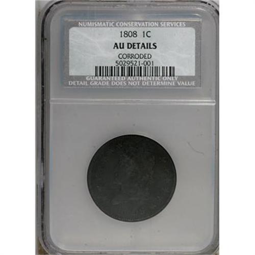 <B>1808 1C --Corroded--NCS. AU Details.</B></I> S-278, B-2, R.3. This variety is easily identified by the leaf tips aligned with the second S of STATES. This walnut-brown example shows little actual wear and great detail for a Classic Head cent, though the obverse shows noticeable areas of corrosion and the reverse exhibits small pockets as well. EAC 20.<BR><BR><B>Coin Engraver:</B> John Reich<BR><BR><b>Shipping:</b> Coins & Currency (<a target="_blank" href="http://www.heritageauctions.com/common/shipping.php">view shipping information</a>)