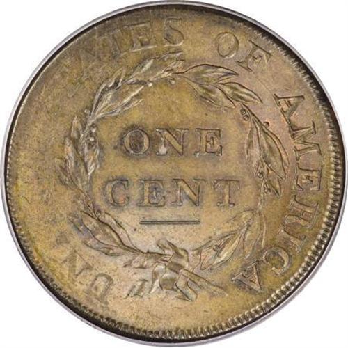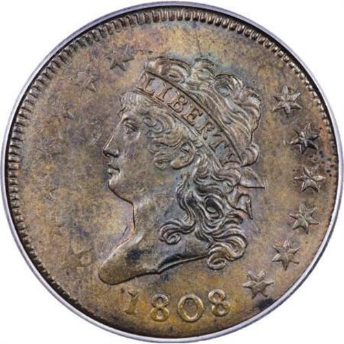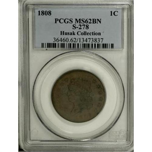 <B>1808 1C MS62 Brown PCGS. S-278, B-2, R.3. </B></I> <B>Noyes AU55; tied for CC-10. Photo #60001. Our EAC Grade MS60.<BR><BR>Equivalents. </B></I>Proskey 2; Doughty 209; McGirk 2A; Clapp 2; EAC 2; <I>Encyclopedia </B></I>1774; PCGS #1543.<BR><B><BR>Variety. </B></I>Wide date, 1 high, sliver on neck. High leaf below right edge of S. The obverse appears on S-278. The reverse appears on S-278.<BR><B><BR>Surfaces. </B></I>A splendid piece despite a rather uneven strike. The right-side stars and Liberty's hair curls are boldly detailed, while the left-side stars are nearly gone. The border dentils from 7 o'clock to 3 o'clock are full and sharp, and nearly invisible elsewhere. The reverse has nearly identical characteristics, with the right side and the wreath all nicely brought up, but most letters to the left nearly flat, especially NITED STA. The reverse border is sharp from 1 o'clock to 9 o'clock, and like the obverse, missing around the rest of the circumference.<BR><BR>The surfaces have minor marks on both sides, including a shallow old scratch from the top hair curl to the border above. Most remaining imperfections are trivial, and some may remain from the original planchet prior to coining. Such marks are especially noticeable at the weakly struck portions of the obverse and reverse. Full cartwheel luster remains on the olive-tan surfaces, with hints of pale blue toning and traces of original mint red on the reverse. A few splashes of darker olive are scattered across the obverse.<BR><BR><B>Die State I. </B></I>Apparently the earliest die state, although the State II rim break below the date may be present. Since the border is missing entirely at this location, the actual die state is impossible to ascertain. Breen and Smith both mention that flowlines connect stars 10, 11, and 12 to the border in State II. Faint flowlines are visible in this area, but there is no apparent distortion of the stars. We can be certain that the die state is earlier than Breen's State IV (Smith state 3), as a rim break above stars 5 and 6 has not formed.<BR><BR><B>Census. </B></I>Only about 20 Mint State 1808 large cents are identified by Bland or Noyes, and approximately half of those are S-278. Nearly 10 more are known in the AU grades.<BR><BR><B>Commentary. </B></I>Sheldon and Breen agree that S-278 is the scarcest of the three 1808 varieties, yet it appears more often than the other two varieties at auction and is more plentiful in higher grades.<BR><BR><B>Provenance. </B></I><I>Chris Victor-McCawley (9/2006).</B></I><BR><BR><B>Personality. Johann (John) Reich</B></I> was born in Bavaria in 1768 and came to America circa 1800. It is believed that he came as an indentured servant, paying off his debt soon afterward. He was hired as assistant engraver on April 1, 1807, and served exactly 10 years, resigning his position on March 31, 1817. Reich died in Albany, New York, in 1833. His reason for leaving the Mint was that he acted as engraver but was paid as assistant engraver. Upon his arrival, Reich prepared new designs for all denominations, including the Classic Head half cents and large cents. He was considered one of the finest artists in his discipline. Urging the employment of Reich, Mint Director Robert Patterson wrote to Thomas Jefferson: "The beauty of our coins would be greatly improved by the assistance of his masterly hand."<BR><BR><b>Shipping:</b> Coins & Currency (<a target="_blank" href="http://www.heritageauctions.com/common/shipping.php">view shipping information</a>)