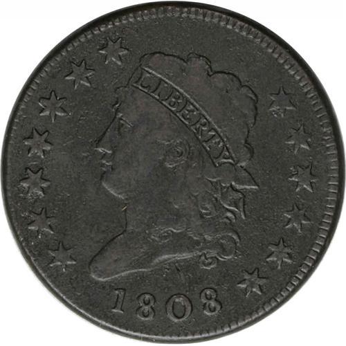 <B>1808<1C> S-277, B-1, R.2--Environmental Damage--NCS. VF Details. VG10 EAC.</B></I> Die State IV with an arc crack through D and into the wreath. All 13 stars are clearly visible on this example. Lightly corroded greenish surfaces with subdued brown color on the devices. Envelope Included.
