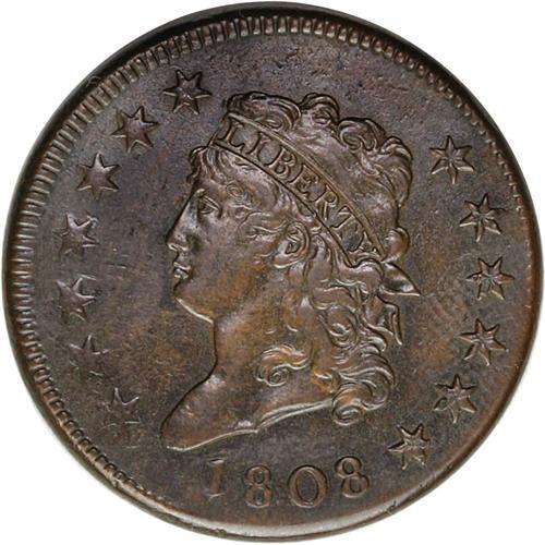 <B>1808<1C> S-278, B-2, R.2--Improperly Cleaned--NCS. AU Details. VF30 EAC.</B></I> A sharply defined representative with attractive medium to dark brown color applied to both surfaces, and accented by hints of pale blue. Excellent surface quality, and an attractive example nonetheless. The surfaces of this example may have been lightly burnished at one time. It appears to be an early die state without flowlines, and with none of the stars drawn to the rim.<BR><I>Ex: George Ramont (2/17/1995).</B></I> Envelope Included.