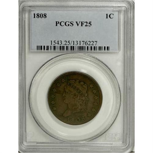 <B>1808 1C VF25 PCGS.</B></I> PCGS Population (3/63). NGC Census: (3/43). Mintage: 1,007,000. Numismedia Wsl. Price for NGC/PCGS coin in VF25: $530. (#1543)<BR><BR><B>Coin Engraver:</B> John Reich<BR><BR><b>Shipping:</b> Coins & Currency (<a target="_blank" href="http://www.heritageauctions.com/common/shipping.php">view shipping information</a>\)