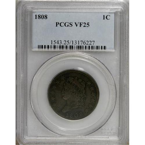 <B>1808 1C VF25 PCGS.</B></I> S-278, B-2, R.3. The reverse is distinctive, with the pair of leaftips aligned with the right edge of the second S in STATES. This attractive, moderately circulated piece shows relatively few marks on its chocolate-brown and teak surfaces. A lovely example of this Classic Head issue. EAC 12.<BR><BR><B>Coin Engraver:</B> John Reich<BR><BR><b>Shipping:</b> Coins & Currency (<a target="_blank" href="http://www.heritageauctions.com/common/shipping.php">view shipping information</a>)