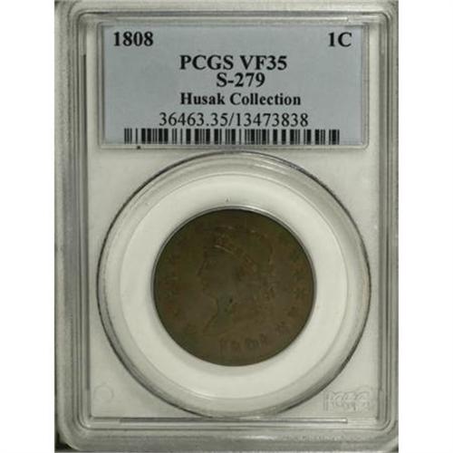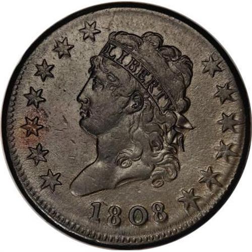 <B>1808 1C VF35 PCGS. S-279, B-3 R.1. </B></I> <B>Noyes VF25; tied for CC-24. Photo #36925. Our EAC Grade VF25.<BR><BR>Equivalents. </B></I>Proskey 1; Clapp 3; EAC 3; <I>Encyclopedia </B></I>1774; PCGS #1543.<BR><B><BR>Variety. </B></I>Edge of curl over inner left curve of 8. Leaf point below left upright of F. The obverse appears on S-279. The reverse appears on S-279.<BR><B><BR>Surfaces. </B></I>Both sides have splashes of maroon, the result of removed corrosion. The otherwise-smooth surfaces exhibit lovely olive and matte gold color with heavy flowlines providing a semblance of cartwheel luster. Although each side has its share of minor scattered surface marks, the overall appearance is excellent. A small nick above the space between the 1 and 8, and a few other blemishes in the left obverse field are evident but undistracting.<BR><B><BR>Die State II. </B></I>An intermediate die state, equal to Smith state 2. Pete Smith records three different die states, while Walter Breen details six die states for S-279. Flowlines extend the stars along the right side to the rim. Faint clash marks are visible, especially on the reverse, and most of the border dentils are gone. Only about half of the obverse border detail is still visible.<BR><B><BR>Census. </B></I>Bland records a small number of Mint State and AU coins in his Census.<BR><B><BR>Provenance. </B></I><I>Bowers and Merena (6/1996), lot 126, $1,100; Chris Victor-McCawley (7/2005).</B></I><BR><B><BR>Personality. </B></I>The numismatic partnership of Q. David Bowers and Raymond N. Merena, <B>Bowers and Merena Galleries</B></I> was organized in 1983 as the successor to Bowers and Ruddy. Located in Wolfeboro, New Hampshire, the firm conducted many important auctions and operated a sales department, issuing the <I>Rare Coin Review </B></I>on a periodic basis. The three Norweb sales, two Eliasberg sales, and four Harry Bass sales rank among the most important auctions of the 20th century. In 2000, Bowers and Merena was sold to Collectors Universe, relocated to Louisiana in 2003, was resold to Spectrum Numismatics and again relocated, this time to California in 2004.<BR><BR><B>Coin Engraver:</B> John Reich<BR><BR><b>Shipping:</b> Coins & Currency (<a target="_blank" href="http://www.heritageauctions.com/common/shipping.php">view shipping information</a>)