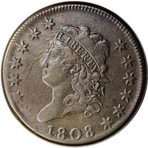<B>1808 1C XF45 PCGS. S-277, B-1, R.2. </B></I> <B>Noyes VF25; CC-20. Photo #35071. Our EAC Grade VF30.<BR><BR>Equivalents. </B></I>Proskey 1A; Doughty 208; McGirk 1A; Clapp 1; EAC 1; <I>Encyclopedia </B></I>1773; PCGS #1543.<BR><B><BR>Variety. </B></I>Date wide and even. Leaf point below right base of F. The obverse appears on S-277. The reverse appears on S-277.<BR><B><BR>Surfaces. </B></I>Attractive olive surfaces have some darker steel-brown mottling, especially in the right obverse field and at the central reverse. Traces of lighter gold iridescence is evident on the reverse. Each side has the usual insignificant marks consistent with the grade, most noticeable between the 1 and 8, and near star 3. Considerable strength is evident at the obverse border closest to 12 o'clock, with the opposing border below the date weak or missing. Most of the reverse border is indistinct due to the late die state.<BR><BR><B>Die State VIII. </B></I>Possibly Breen's Die State IX.<B> </B></I>Smith Die State 7, the latest he recorded. Pete Smith prepared a comprehensive study of Classic Head cents that appeared in an ANS Coinage of the America's Conference study in 1988. The obverse has prominent flowlines, with weakness at stars 1 and 2. Clash marks are evident in the left field. The reverse has flowlines, clash marks, and three heavy cracks. The first reverse crack begins at the border over D, bisects that letter, and arcs up through the inside edge of the wreath to the final S, reaching the border at the right serif of that letter. The second crack branches from the first, follows the inside edge of the upright of the D, crosses three leaves, and disappears within blurred clash marks near the upper left side of the O. A triangular die chip forms between those cracks, inside the D. A third die crack begins in near a leaf below the end of the second crack, crosses the lower right curve of the O and the upper left upright of N, curving through the field over E, and continues through the wreath to the right foot of the first A in AMERICA and on to the border. Breen and Smith both record the third crack as a continuation of the second crack; however, they appear to be unrelated.<BR><BR><B>Census. </B></I>Although a common variety, the S-277 is elusive in top grades. Only about six Mint State examples are known, along with 10 AU coins. Despite the low grade given this coin by Noyes, it is still easily among the two dozen finest examples known.<BR><BR><B>Commentary. </B></I>John Reich's new design appeared on the large cents from 1808 until 1814, and on the half cents from 1809 through 1836. This cataloger wrote in the Eliasberg Catalog that the Classic Head name was an innovation of Kenneth E. Bressett, along with Matron Head and Petite Head, as he sought standard names for the <I>Guide Book</B></I>.<BR><BR><B>Provenance. </B></I><I>Frederic W. Geiss (B. Max Mehl, 6/1947), lot 104, $12.25; Louis E. Eliasberg, Sr. (Bowers and Merena, 5/1996), lot 531, $1,430.</B></I><BR><BR><B>Personality. Frederic W. Geiss</B></I> of Chicago formed an extensive coin collection that was sold by B. Max Mehl in February 1947. John W. Adams records 116 sales held by Mehl, and 28 of those hold an overall A rating, including the sale of the Geiss Collection. The Geiss Collection rates as one of Mehl's most important sales for large cent collectors, but also carries individual A ratings for proofs, early silver, U.S. gold, private gold, and modern U.S. material.<BR><BR><b>Shipping:</b> Coins & Currency (<a target="_blank" href="http://www.heritageauctions.com/common/shipping.php">view shipping information</a>)