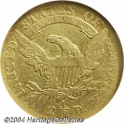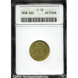 <B>1808<$2 1/2> Fine 12 ANACS.</B></I> Bass-3017, Breen-6125, R.4. The only dies. The 1808 Capped Bust Quarter Eagle, one of a mere 2,710 pieces minted, is needed by the modest number of date collectors of United States gold, but enjoys even heavier demand as a one-year type coin. The reason for this one-year quarter eagle delivery is most likely due to the favored status of the half eagle among gold depositors. Breen (1988) asserts that banks normally specified the denomination into which they wanted their deposits of foreign coins or native bullion coined, and over 90% of the time they wanted most or all of their deposits coined into half eagles. Indeed, the Philadelphia Mint suspended quarter eagle production from 1809-1820 due to lack of demand. The current example is yellow-gold, with slightly darker color in some of the areas adjacent to the design elements. The devices are evenly worn, and exhibit nice detail for the grade. The only notable weakness is along the right borders of each side, which is typical for the issue. The surfaces are relatively clean for a coin in this grade, with just a few trivial, hardly noticeable marks to report.<BR><I>From The Paulsboro Collection, Part Two.</B></I> <BR><BR><B>Important notice:</B> Heritage usually auctions material at the rate of 200-250 lots per hour. On some occasions eBay Live bid software or the Internet may not be able to keep up with the pace of the auction. We recommend placing a realistic absentee bid now as insurance to avoid disappointment. Occasionally the auctioneer may eliminate or reject an eBay Live bid, and the auctioneer may also reopen a lot after the close of the eBay live bidding (usually because we missed an audience bid), and may reject your bid even if it shows you as the winning bidder. By bidding via eBay Live, you agree that Heritage may award the lot to another bidder at its sole discretion under the circumstances described above or any other reasonable circumstances. Since eBay bids are not shown to us until we open the lot on the floor, we treat those bids just like floor bids. In most cases the floor responds before the eBay bid is presented to us, due to Internet lag time, so for consistency we have made it a policy that floor bids are always considered first over tie eBay live bids. Also please note that all Heritage lots purchased through eBay Live carry a 20% Buyer's Premium. Please make sure you read the Terms and Conditions before you bid. </span></font></tr></table></td></tr></table>