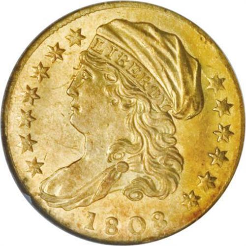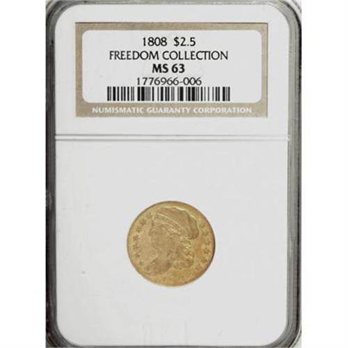 <B>1808 $2 1/2 MS63 NGC.</B></I> Ex: Freedom Collection. Breen-6125, Bass-3017, BD-1, R.4. Johann Matthias (John) Reich joined the Mint engraving staff on April 1, 1807, and served a 10-year tenure until March 31, 1817. He was responsible for the Capped Bust coinage so familiar today. Reich set about redesigning every denomination from the half cent through the half eagle. In 1807, his Capped Bust design appeared for the first time on half dollars, and a similar design also appeared on the half eagles in 1807. Early the next year, a modification of this design, known today as the Classic Head, appeared on large cents and followed on the half cents in 1809. For silver coins, the Capped Bust design was utilized for dimes in 1809, quarter dollars in 1815, and half dimes in 1829. Silver dollars and eagles were not in production, so the Reich designs never appeared on those denominations. Perhaps the single most important entry in the Reich parade of designs is the quarter eagle of 1808.<BR> John Reich was a Bavarian native who learned the engraving trade from his father, Johann Christian Reich. According to L. Forrer in the <I>Biographical Dictionary of Medalists:</B></I> the elder Reich was "born at Eisenberg (Saxe-Altenburg) about 1740, settled at Furth in 1758, and died in 1814. He probably began as an assistant to a Counter-manufacturer, but started business on his own account about 1770, as shown by various counters bearing his name, some of which refer to the famine of 1771/1772. He had a factory of organs, clocks, mathematical instruments, musical boxes, and other objects. Of that period is a series of medals by him dated 1771 and 1772, and commemorating also that famine." The younger Reich, according to Forrer, collaborated with his father from about 1789 to 1800. Johann Matthias was born in Furth in 1768. Many of the medals issued during those years with the signature of Reich were the work of father and son together.<BR> John Reich immigrated to America in 1800, settling in Philadelphia. Apparently he came at the suggestion of Henry Voigt, quickly gaining the attention of Mint Director Elias Boudinot. In a June 16, 1801 letter to President Thomas Jefferson, Boudinot commented that "I have been waited on by Mr. Reich and was much pleased with his work." Jefferson, in turn, agreed to have Reich prepare the design for his own Indian Peace medal.<BR> Robert Patterson replaced Boudinot as Mint director, then hired Reich as assistant engraver. A short time later, another engraver arrived from Europe. Moritz Fürst came to Philadelphia and "was firmly convinced that he was to assume the office of chief engraver, according to representations which had been made to him by Thomas Appleton, the American consul at Leghorn," according to Georgia S. Chamberlain in the March 1955 issue of <I>The Numismatist.</B></I> Eventually, both Reich and Furst worked on designs for various medals at the Mint. Reich left his post at the Mint in 1817, and spent his remaining 16 years in Albany, New York.<BR> The 1808 quarter eagle is the only issue of this denomination to display Reich's handiwork. Only 2,710 pieces were minted during the year, and it is likely that all were from this single pair of dies. Only one variety is known, with approximately 150 surviving pieces. The combination of a low survival and high demand from type, date, and variety collectors ensures that examples are infrequently offered and hotly contested when they are made available. In Walter Breen's <I>Complete Encyclopedia,</B></I> the author states: "No archives documentation explains the small mintage, abandonment of the design, or noncoinage of quarter eagles for the dozen years to follow. All we have is conjectures; mine follow." Essentially, Breen suggested that the banks, who made regular deposits of gold to be converted to coin, preferred the half eagle coins: "over 90% of the time they wanted most or all their gold deposits coined into half eagles." This same reason is usually quoted for large production of half eagles throughout the early 19th century, but it fails to explain why the largest gold coin of that time, the eagle, had not been produced since 1804, not to appear again until 1838.<BR> The scintillating example that we offer represents the usual die state with an obverse die crack through the rear peak of the cap, continuing over the cap to the left, and through all stars on the right. There is no evidence of die lapping or any other cracks on either side. It is believed that the obverse die actually cracked as it was being made, and that no perfect-die coins exist. As always, the border dentils are weak and almost nonexistent on the obverse. The surfaces are lightly abraded as always, with faint adjustment marks visible through ES OF on the reverse. The central obverse and reverse design detail is bold, and the overall eye appeal is excellent. Both sides are fully lustrous, with slightly reflective fields and rich orange-gold color. Hints of rose patina complete the picture. Census: 5 in 63, 1 finer (12/07).<BR><I>From The Madison Collection.</B></I><BR><BR><b>Shipping:</b> Coins & Currency (<a target="_blank" href="http://www.heritageauctions.com/common/shipping.php">view shipping information</a>)
