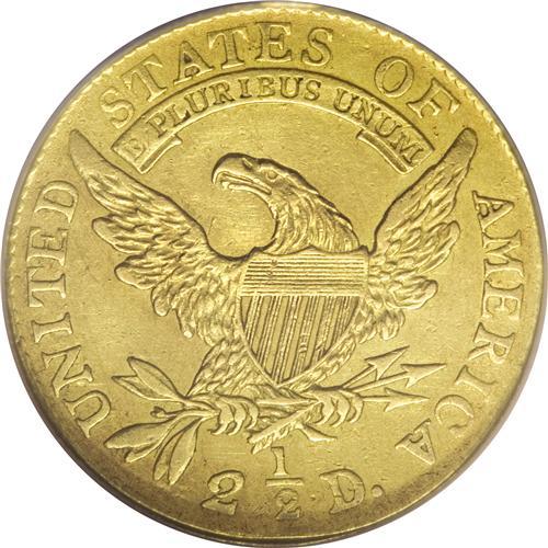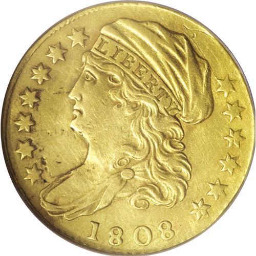 <B>1808 $2 1/2 --Repaired--NCS. AU Details.</B></I> Breen-6125, Bass-3017, R.4. The 1808 quarter eagle is not merely a rare date. It is the only quarter eagle issue of the Capped Bust Left type, although in half eagle format, John Reich's design was struck annually between 1807 and 1812. If patterns are discounted, only the 1796 No Stars quarter eagle presents a greater challenge for type collectors. The present sharply defined green-gold piece is subdued. The left obverse field is sunken from tooling, and also has a couple of tiny dark spots. A shallow depression on the base of Liberty's neck is possibly as made. A short pinscratch is unobtrusively located near 1 o'clock. The reverse is lightly hairlined but otherwise problem-free. Despite its repair, the present piece provides a rare type set opportunity.<BR><BR><b>Shipping:</b> Coins & Currency (<a target="_blank" href="http://www.heritageauctions.com/common/shipping.php">view shipping information</a>)