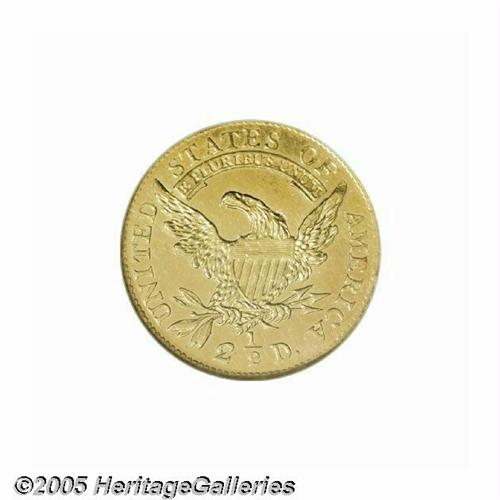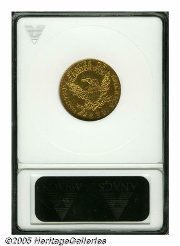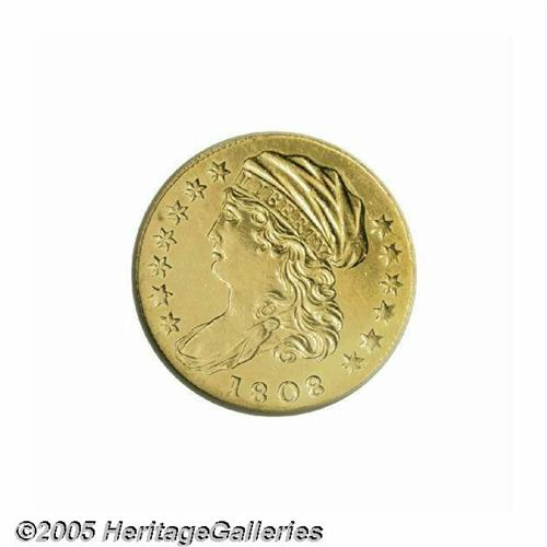 <B>1808<$2 1/2>--Scratched, Cleaned--ANACS. Unc Details, Net AU50.</B></I> Bass-3017, Breen-6125, R.4. The only known dies. John Reich's sole contribution to the U.S. Quarter Eagle series was a single set of dies of the Capped Bust Left type. Mated together on only one occasion, these dies produced 2,710 coins on February 26, 1808. No more Quarter Eagles would be produced until 1821, by which time the Capped Bust Left design had yielded to Robert Scot's Capped Head Left motif. Although not as rare as some catalogers have claimed, the 1808 is still an important one-year type.<BR> Typically weak at the borders with generally sharper striking detail toward the centers, the present example displays somewhat unnatural pink-gold color over noticeably cleaned surfaces. The diagnostic obverse die crack (as struck) that joins the back of Liberty's cap to stars 8-13 is present, and it may point to early die breakage that explains the brevity of the type. A thin scratch is noted from Liberty's mouth to her hair curl.