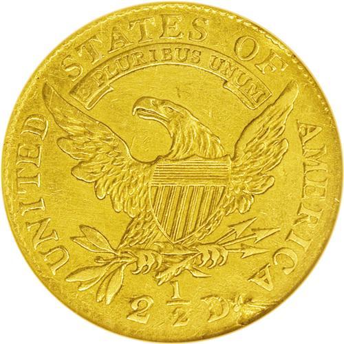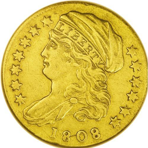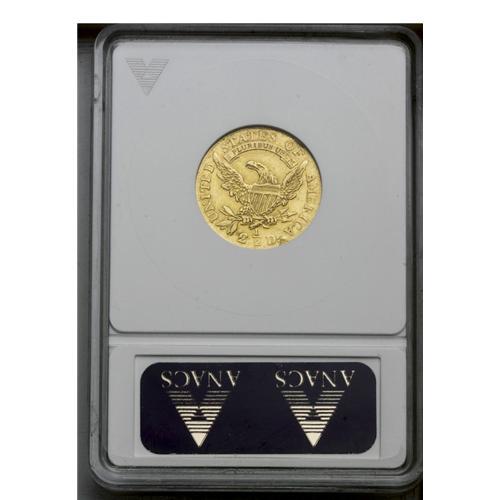 <B>1808<$2 1/2> VF30--Cleaned--ANACS.</B></I> Bass-3017, Breen-6125, R.4. One of the rarest of all U.S. type coins, the 1808 quarter eagle is estimated by some numismatic authorities to exist in quantities as small as 35 to 40 examples, in all grades combined. The design of this coin, with little or no protective rims, exposed the border and central details to early and excessive wear. Despite the ANACS admonition, this coin is attractive, with pretty medium yellow-gold color on both sides. Perusal with a loupe reveals a light scrape in the left obverse field, and on the reverse there is a small, triangular planchet flaw after the denomination. Light field chatter and hairlines are also present, but overall the coin is an appealing and collectible example of this, one of the most highly coveted and sought-after issues in all of U.S. numismatics.<BR><I>From The Chief Paduke Collection.</B></I>