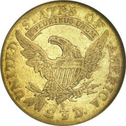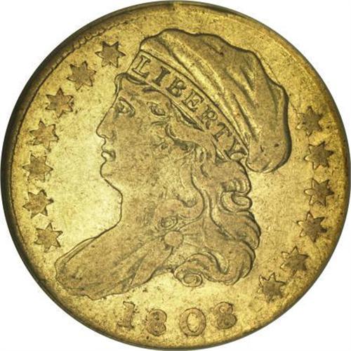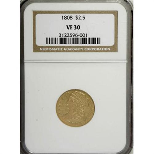 <B>1808 $2 1/2 VF30 NGC.</B></I> Breen-6125, BD-1, R.4. As early as 1807, there were concerns about Mint Chief Engraver Robert Scot's "health," for which read "poor eyesight." John Reich was hired as assistant engraver, no doubt over the strenuous objections of the older artisan. Mint Director Robert Patterson tasked the younger engraver with a total redesign of U.S. coinage, a direct insult, whether intended or not, to Scot. The coins that first drew his attention were the workhorses of the silver and gold denominations, the half dollar and half eagle. The Capped Bust, Lettered Edge half dollars made their debut in 1807, as did the Capped Bust to Left half eagles. In 1808 Reich redesigned the quarter eagle along the same lines, but while the larger-mintage half eagles were produced yearly from 1807 to 1812, the Capped Bust to Left quarter eagle was a one-year type coin, as quarter eagles were produced again only in 1821, with a new design.<BR> The 1808 quarter eagle is well-known to collectors as a difficult, elusive, and in-demand type, along with its close cousin, the 1796 No Stars quarter eagle. The small emission of 2,710 quarter eagles represents the sole appearance of Reich's design on the quarter eagle, and is responsible for the ceaseless demand for the issue from date and type collectors. <BR><I> </B></I>This midgrade circulated specimen may fill some fortunate collector's want list, as it is a problem-free example of the type. The greenish-gold surfaces still show some contrast between the fields and devices, with muted luster present. There are, of course, a few light contact marks on each side, but no distracting scrapes or abrasions. The piece displays<I> </B></I>the usual die state<I>,</B></I> with an obverse die crack through the rear peak of the cap, continuing over the cap to the left, and through all stars on the right.<I> </B></I>Expect fierce bidding on this piece, and act accordingly.<BR><I>From The John Stimson, Sr. Collection, Part One.</B></I><BR><BR><b>Shipping:</b> Coins & Currency (<a target="_blank" href="http://www.heritageauctions.com/common/shipping.php">view shipping information</a>)