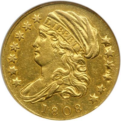 On the obverse, Liberty faces left, wearing a soft cap similar to the fashionable headgear worn by women of the day. It is inscribed LIBERTY on the headband. Her bust is lightly draped (the cap and drapery give the coin one of its names). The reverse first used on the half eagle in 1807 as well, and on the quarter eagle in 1808, has an eagle with its wings outstretched, head over its shoulder. It grasps an olive branch (representing peace) in the right claw and three arrows in the left (for war). The eagle's head direction towards the olive branch implies a preference for peace in heraldry. A shield overlays the eagle's breast. The denomination appears below. This is the first instance of a denomination on a U.S. gold coin.