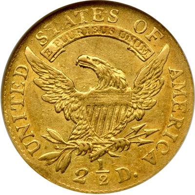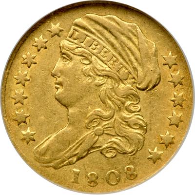 1808 $2.50 Capped Bust. . BD-1, Breen-6125. NGC graded AU-58. Popular first year type coin. 2,710 struck. According to numismatic researcher William T. Gibbs, "On the obverse, Liberty faces left, wearing a soft headgear that resembles a nightcap, inscribed LIBERTY on the headband. Her bust is lightly draped (the cap and drapery give the coin one of its names).