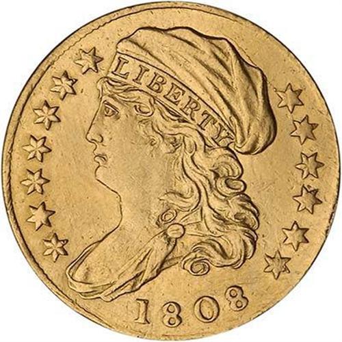 Lightly cleaned but plainly above average for the grade and year. The 1808 is a key one-year Type (unlike the half eagle whose design by John Reich continued from 1807 through 1812). Typical for the issue are flat stars on the right, one or two flat stars on the left but the others showing their radial lines; The rims are either gone or only smooth outlines rather than normal denticles. As for the centers, this has a very good strike, including most hair curls and the clasp at the shoulder which holds the drapery together. The eagle is well detailed, as is the shield. Again, the rim is unevenly struck, showing a few denticles along the left and lower portion, but an absense of a rim elsewhere, as though the dies were slightly tilted out of alignment in the press. Only 2,710 pieces were minted of the rare 1808.