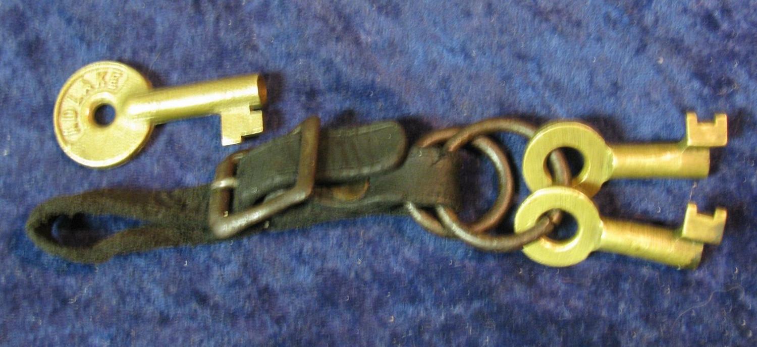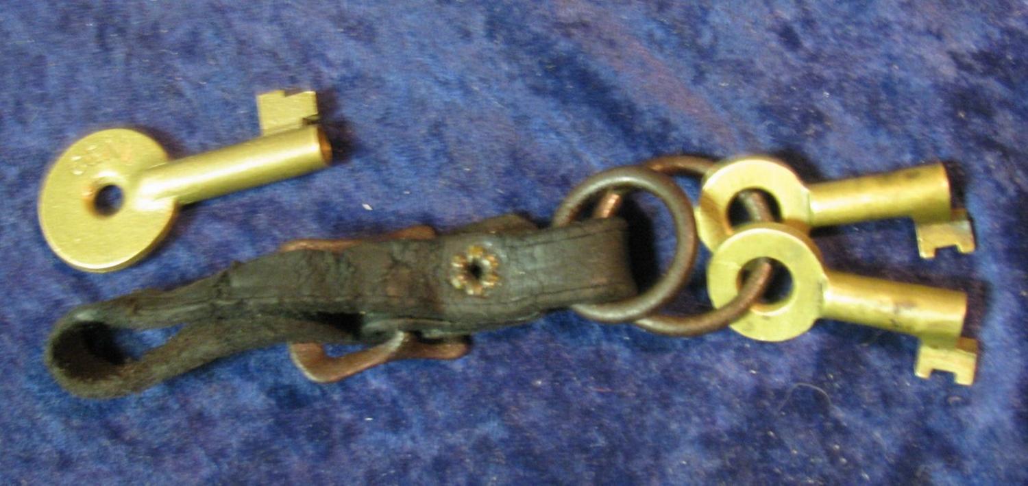 1808. (3) Large Brass Railroad Lock Keys on a Leather Fob.