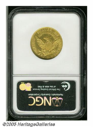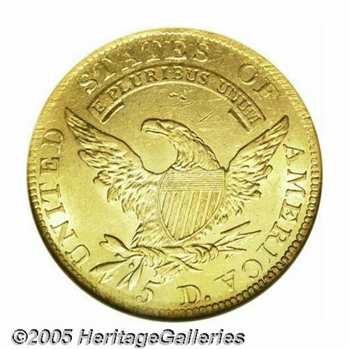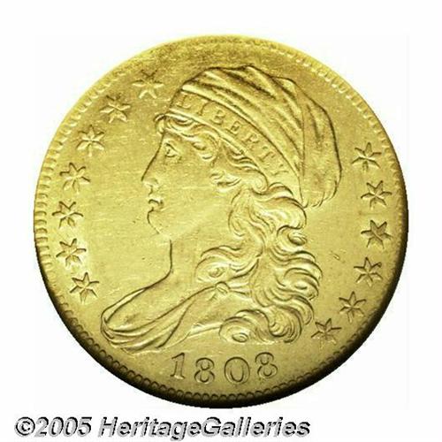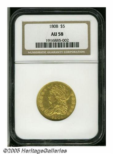 <B>1808<$5> AU58 NGC.</B></I> Wide 5D, Breen-6457, B. 4-B, Miller-107, R.4. Light wear on the cheek and drapery folds prevents a Mint State grade, but this sunrise-gold representative has no shortage of bright luster. Well struck aside from moderate softness at 11 o'clock on the obverse and opposite at 7 o'clock on the reverse, likely caused by a tapered planchet. A solitary minor vertical mark on the neck is of little relevance.<BR><I>From the Dr. Kurt Peters Collection.</B></I> From the Dr. Kurt Peters Collection.