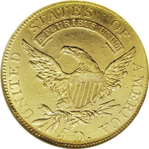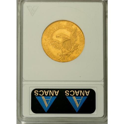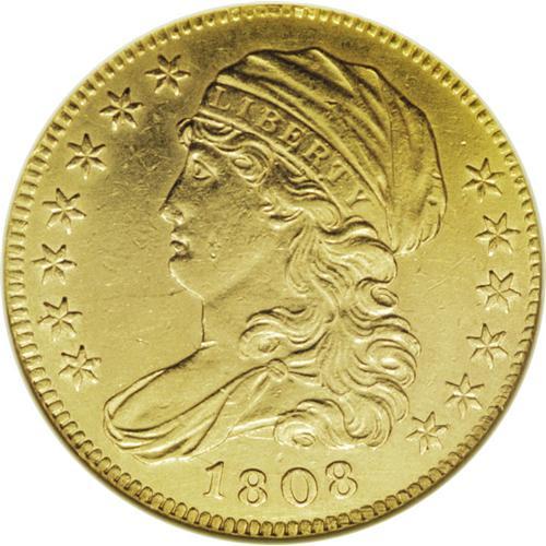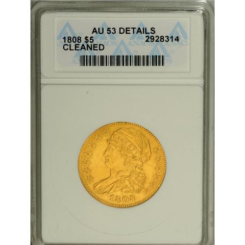 <B>1808 $5 --Cleaned--ANACS. AU53 Details.</B></I> Close 5D, Breen-6456, BD-3, R.4. Non-overdate with date centered between dentils and bust, A of STATES centered over LU of PLURIBUS, and the first A of AMERICA away from the wing. Yellow-gold surfaces display traces of luster in protected areas, and all of the motifs are nicely defined. Some inoffensive hairlines are visible under magnification.<BR><BR><b>Shipping:</b> Coin/Currency (<a target="_blank" href="http://www.heritageauctions.com/common/shipping.php">view shipping information</a>)