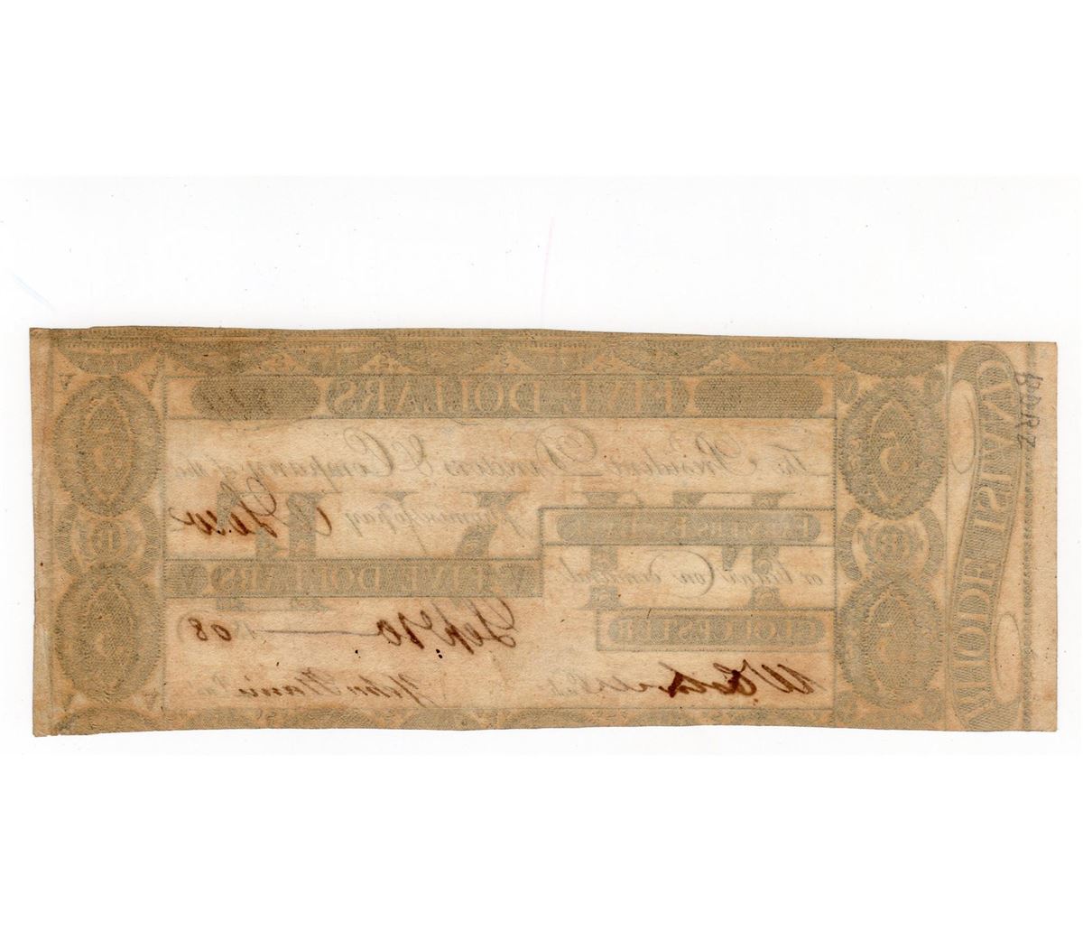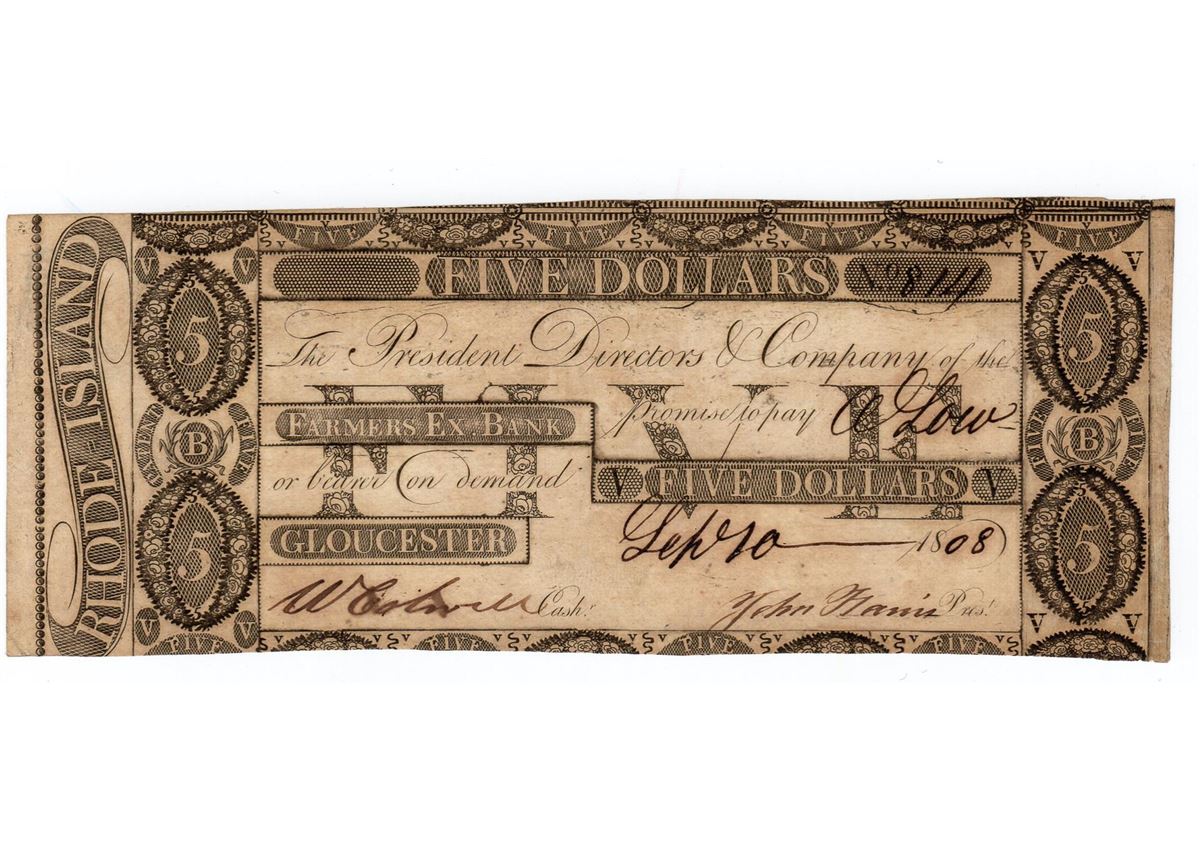 One 1808 $5 Farmers Ex. Bank Rhode Island Obsolete Bank Note.