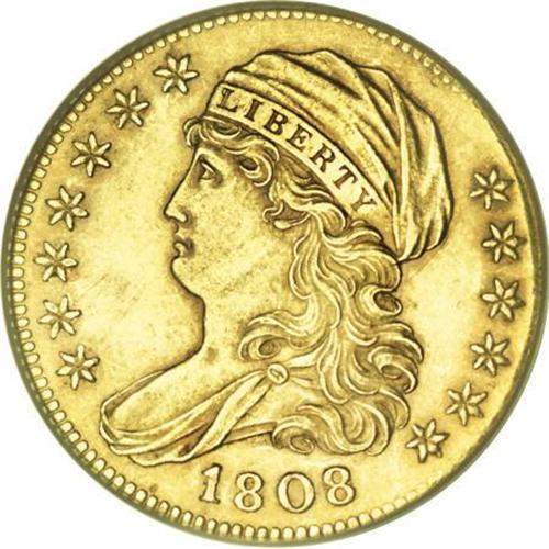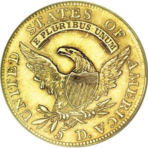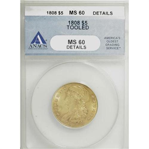 <B>1808 $5 --Tooled--ANACS. MS60 Details.</B></I> Wide 5D, Breen-6457, BD-4, High R.3. The reverse is boldly clashed, as usual for the variety although the die state is unlisted in the Bass-Dannreuther reference. Luster fills all but the open fields, and friction is limited to two curls beneath the cap. A cluster of thin pinscratches near star 1 suggests a spot was effaced.<BR><I>Ex: George N. Polis, M.D. Collection (Bowers and Merena, 6/91), lot 1502.</B></I><BR><I>From The John Stimson, Sr. Collection, Part Two.</B></I><BR><BR><B>Coin Engraver:</B> John Reich<BR><BR><b>Shipping:</b> Coins & Currency (<a target="_blank" href="http://www.heritageauctions.com/common/shipping.php">view shipping information</a>)