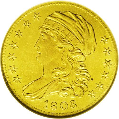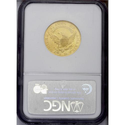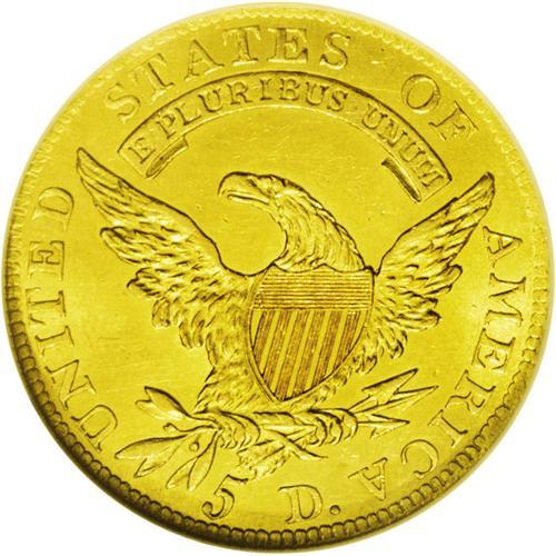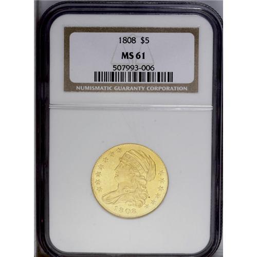 <B>1808<$5> MS61 NGC.</B></I> Wide 5D, Breen-6457, B. 4-B, Miller-107, R.4. The 1 in the date is slightly higher than the adjacent 8. On the reverse the D in the denomination is far from the 5, almost equidistant between it and the last A in AMERICA. The present example offers pleasing greenish-gold surfaces. A slightly off-center strike has made the obverse dentilation strongest from 8 to 10 o'clock and weakest from 3 to 4 o'clock. Some light adjustment marks are seen near the reverse rim in that area, and a single dark toning spot is mentioned behind Liberty's neck. The piece is pleasingly well struck, with especially bold reverse details.<BR><I>From The Antigo Collection.</B></I>