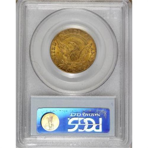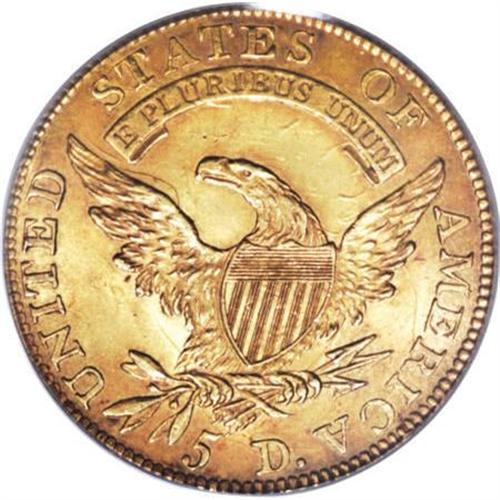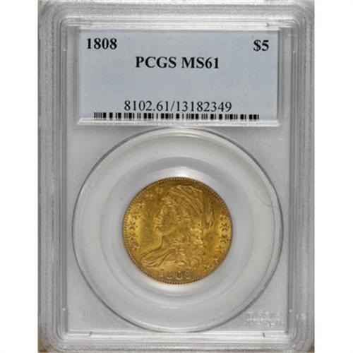 <B>1808 $5 MS61 PCGS.</B></I> Wide 5 D, Breen-6457, BD-4, High R.3. This variety is confirmed by the non-overdate with the date centered between the dentils and the bust, a widely spaced 5 D, centering of the A in STATES over the U of PLURIBUS, and the A near the wing.<BR> Apricot-gold surfaces display hints of light tan, with the most potent luster residing in the areas around, and in the interstices of, the motifs. An attentive strike brings out sharp definition on the well centered design elements. Clash marks are noted on both sides, and a reverse crack travels from the middle of the left (right facing) wing through RICA and D to the field below the right (left facing) wing. Overall, a sharp early half eagle.<BR><BR><b>Shipping:</b> Coins & Currency (<a target="_blank" href="http://www.heritageauctions.com/common/shipping.php">view shipping information</a>)