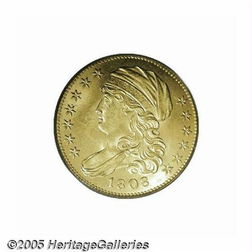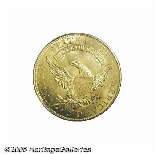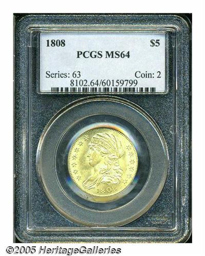 <B>1808<$5> MS64 PCGS.</B></I> Breen-6456, B. 4-A, Miller-106, R.5. Although 1808 Half Eagles are not rare in Mint State, they are certainly scarce, and examples of this die variety are seldom seen. In fact, there are probably not more than a couple examples of the variety in similar quality, including the Harry Bass specimen that was retained by the Bass Foundation. This is a sharply struck and highly lustrous example with frosty surfaces and light greenish-gold color. Only a few slight abrasions in the fields keep this from Gem quality and probable finest known status. Even the PCGS population data, which consider all varieties of a given issue, suggest that only one finer example has been certified. An extremely important opportunity that should not be missed. This example is well suited for a type set, date set, or advanced variety collection.
