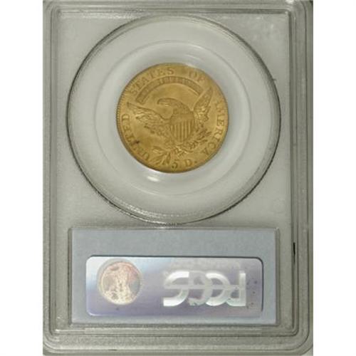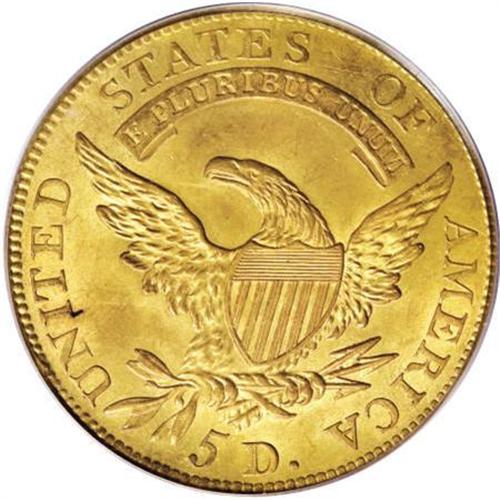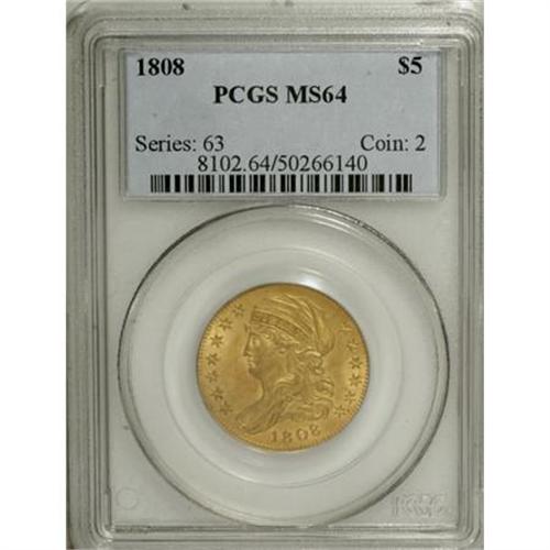 <B>1808 $5 MS64 PCGS.</B></I> Close 5D, Breen-6456, BD-3, R.4. This variety has confused many notable numismatists over the past century. Part of the reason for this is its similarity to BD-2, which shares the same reverse die. One way to tell the two varieties apart is to examine the exact center of the obverse. BD-3 shows a tiny dot, probably from a compass point when the die was first laid out. BD-2 instead has a small incused circle in the same location. BD-3 and BD-4 use the same obverse die, further complicating matters. Clapp and Newcomer failed to collect or designate BD-3, but Edgar H. Adams noted it as his number 3. Breen (1966) listed two 1808 die pairs, 3-A and 4-A, that each turned out to be different die states (unclashed and clashed) of BD-3. Miller (1997) continued Breen's error, as Bass' research was yet unpublished. The present piece is the unclashed die state, which Dannreuther catalogs as Obverse State a and Reverse State d.<BR>This boldly struck near-Gem has original green-gold toning, with hints of peach across the open fields. The surfaces are impressively smooth, and in fact the only feature that can be used for pedigree purposes is a tiny area of dark toning near the left foot of the I in UNITED. Unquestionably among the finest known 1808 BD-3 half eagles.<BR>As of (6/07), PCGS reports 10 pieces certified as MS64, with one finer. However, these figures combine BD-3 and BD-4 examples, and there may be resubmissions as well. The sole MS65 example is a BD-4, although incorrectly described as a "closely spaced denomination" in its appearance as lot 392 in Bowers and Merena's 8/99 Rarities Sale. Our research uncovers eight auction appearances of PCGS MS64 pieces in the past decade, but those represent only three different coins.<BR><I>Ex: Bartle Collection (Stack's, 10/84), lot 1112; Harry W. Bass, Jr. Collection, Part III (Bowers and Merena, 10/99), lot 789; California Sale (Ira & Larry Goldberg, 10/00), lot 888; Wayne Rich Collection (Bowers and Merena, 3/02), lot 222; A Gentleman's Collection of Early Gold Coins (American Numismatic Rarities, 6/05), lot 1011.</B></I><BR><I>From The Julian Collection.</B></I><BR><BR><B>Coin Engraver:</B> John Reich<BR><BR><b>Shipping:</b> Coins & Currency (<a target="_blank" href="http://www.heritageauctions.com/common/shipping.php">view shipping information</a>\)