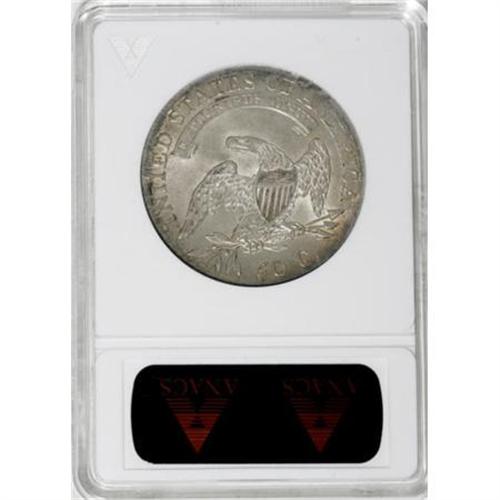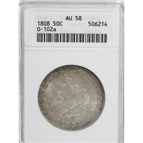 <B>1808 50C AU58 ANACS.</B></I> O-102a, R.2. Cartwheel shimmer is evident on this light tan-gray second-year Capped Bust half. A hair-thin mark above the jaw barely merits mention, and the overall appearance is smooth.<BR><BR><B>Coin Engraver:</B> John Reich<BR><BR><b>Shipping:</b> Coins & Currency (<a target="_blank" href="http://www.heritageauctions.com/common/shipping.php">view shipping information</a>)