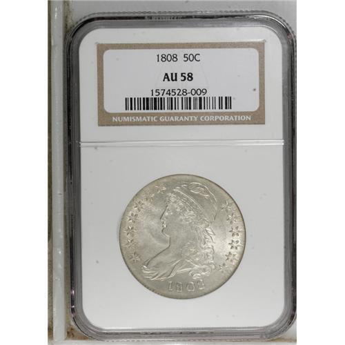 <B>1808 50C AU58 NGC.</B></I> O-103, R.1. The left base of 1 in the date is missing; AM in AMERICA are solidly joined at the bases. The peripheral devices are drawn toward the edges, and die wear gives the fields a granular texture. A bulge in the left obverse field is probably from die clashing. Lustrous and essentially untoned with a pleasingly clean, nearly abrasion-free appearance.<BR><BR><b>Shipping:</b> Coins & Currency (<a target="_blank" href="http://www.heritageauctions.com/common/shipping.php">view shipping information</a>)