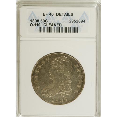 <B>1808 50C --Cleaned--ANACS. XF40 Details.</B></I> O-110, R.5. NGC Census: (29/256). PCGS Population (35/208). Mintage: 1,368,600. Numismedia Wsl. Price: $210. (#6090)<BR><BR><b>Shipping:</b> Coins & Currency (<a target="_blank" href="http://www.heritageauctions.com/common/shipping.php">view shipping information</a>)