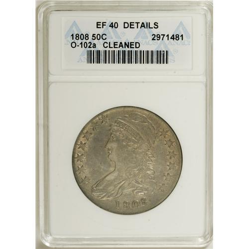 <B>1808 50C --Cleaned--ANACS. XF40 Details.</B></I> O-102a. NGC Census: (60/1294). PCGS Population (36/214). Mintage: 1,368,600. Numismedia Wsl. Price for NGC/PCGS coin in XF40: $210. (#6090)<BR><BR><b>Shipping:</b> Coins & Currency (<a target="_blank" href="http://www.heritageauctions.com/common/shipping.php">view shipping information</a>)