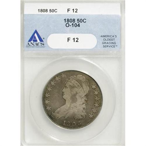 <B>1808 50C Fine 12 ANACS.</B></I> O-104.<B> </B></I>NGC Census: (7/1362). PCGS Population (3/325). Mintage: 1,368,600. Numismedia Wsl. Price for NGC/PCGS coin in Fine 12: $75. (#6090)<BR><BR><B>Coin Engraver:</B> John Reich<BR><BR><b>Shipping:</b> Coins & Currency (<a target="_blank" href="http://www.heritageauctions.com/common/shipping.php">view shipping information</a>)