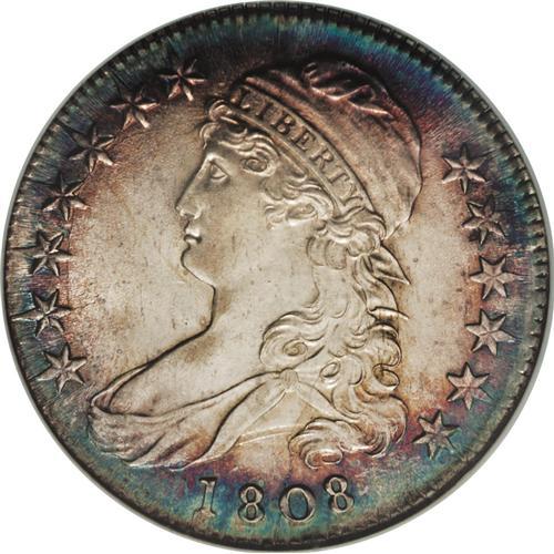 <B>1808 50C MS65 NGC.</B></I> O-102a, R.2. The die cracks on the obverse and reverse of this piece are interesting to contemplate. This is a late die state as usual for the marriage. Both sides are nicely detailed and fully lustrous with brilliant silver surfaces. The obverse is ringed with sea-green, cobalt-blue, and lilac toning, while the reverse is limited to pale green and gold. The obverse has a bisecting vertical crack (actually two cracks that join in the hair) and other cracks. The reverse has several cracks, one that follows the top of the scroll for a short distance before turning downward, through the centers of IBUS on the scroll.<BR><I>Ex: Stack's (10/2004), lot 1377; Stack's (1/2005), lot 2818.</B></I><BR><BR><b>Shipping:</b> Coin/Currency (<a target="_blank" href="http://www.heritageauctions.com/common/shipping.php">view shipping information</a>)