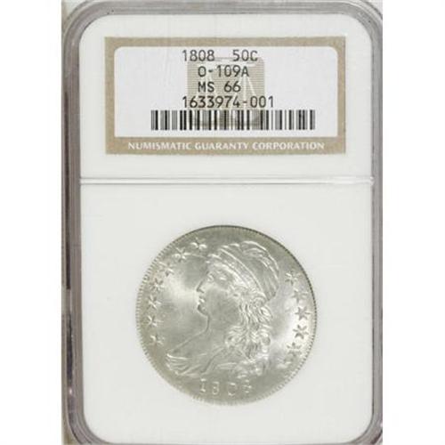 <B>1808 50C MS66 NGC.</B></I> O-109a, R.3. A runaway Condition Census example that is completely brilliant and alive with vibrant, frosted luster. In addition to the faint clashing of the scroll between the portrait and the date and of portions of the eagle's wings on each side of Liberty, there is a network of peripheral die cracks on the obverse indicative of a later die state. Despite extensive die use, virtually all details are extremely well defined. If an equally well preserved example of this die marriage exists, we have neither seen nor heard of it. Census: 2 O-109a halves in 66, 0 finer (12/07).<BR><I>From The Madison Collection.</B></I><BR><BR><B>Coin Engraver:</B> John Reich<BR><BR><b>Shipping:</b> Coins & Currency (<a target="_blank" href="http://www.heritageauctions.com/common/shipping.php">view shipping information</a>)