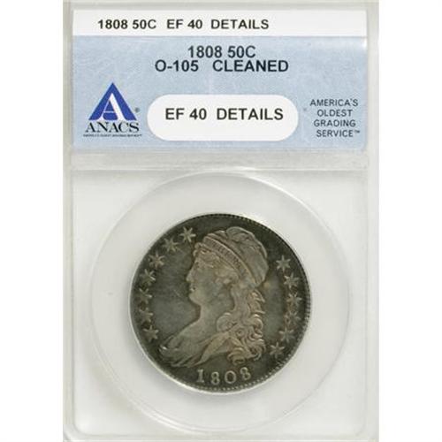 <B>1808 50C --Cleaned--ANACS. XF40 Details. </B></I>O-105<B>.</B></I><BR> NGC Census: (32/1292). PCGS Population (41/221). Mintage: 1,368,600. Numismedia Wsl. Price for NGC/PCGS coin in XF40: $275. (#6090)<BR><BR><B>Coin Engraver:</B> John Reich<BR><BR><b>Shipping:</b> Coins & Currency (<a target="_blank" href="http://www.heritageauctions.com/common/shipping.php">view shipping information</a>)
