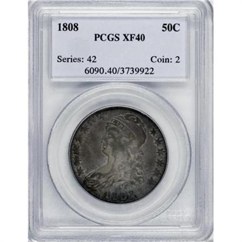 <B>1808 50C XF40 PCGS.</B></I> O-104, R.2. This dove-gray early Capped Bust half is surprisingly unabraded, although careful inspection reveals a few faint hairlines beneath the scroll and a brief mark beneath the lowest arrowhead.<BR><BR><B>Coin Engraver:</B> John Reich<BR><BR><b>Shipping:</b> Coins & Currency (<a target="_blank" href="http://www.heritageauctions.com/common/shipping.php">view shipping information</a>)