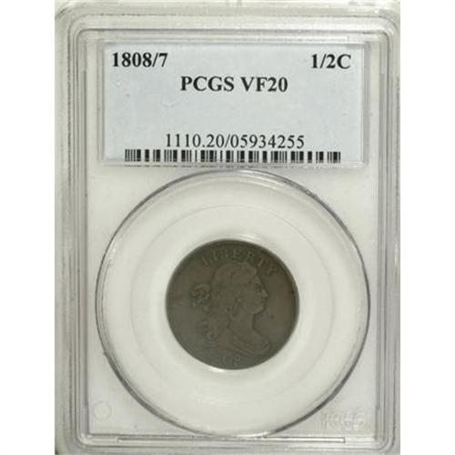 <B>1808/7 1/2 C VF20 PCGS.</B></I> C-2, B-2, R.3. A scarce overdate die pairing that has a leaftip below the foot of the D on the reverse. Pleasingly detailed for the grade assigned with no significantly distracting flaws, merely moderate, honest wear over the teak-brown surfaces. EAC 10.<BR><BR><B>Coin Engraver:</B> Robert Scot<BR><BR><b>Shipping:</b> Coins & Currency (<a target="_blank" href="http://www.heritageauctions.com/common/shipping.php">view shipping information</a>)