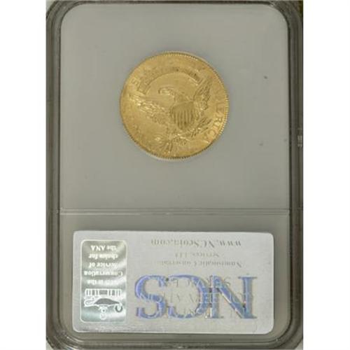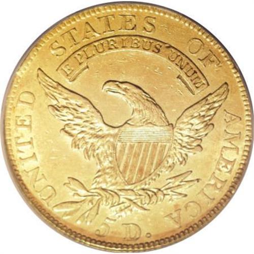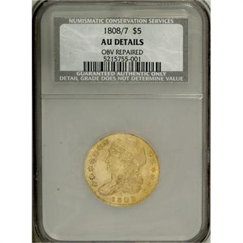 <B>1808/7 $5 --Obverse Repaired--NCS. AU Details. </B></I> Wide Date, Breen-6454, BD-1, R.6. An impressively rare overdate variety, of which perhaps fewer than 30 examples survive, according to Dannreuther and Bass (2006). The second overdate variety of this date and denomination (BD-2) is somewhat less scarce, with approximately 80 to 100 survivors. A vertical die crack that bisects the obverse is the most obvious diagnostic feature that distinguishes BD-1 from BD-2. This example displays pleasing lime-green and peach toning over shimmering surfaces. Highpoint wear and small marks are modest for the AU Details grade. A patch in the left obverse field is shinier and lighter in color than the surrounding areas, indicating an attempt to repair the coin. A less obvious repair is noted behind Liberty's cap. An affordable representative of this extremely important early gold overdate variety. <BR><BR><B>Coin Engraver:</B> John Reich<BR><BR><b>Shipping:</b> Coins & Currency (<a target="_blank" href="http://www.heritageauctions.com/common/shipping.php">view shipping information</a>\)