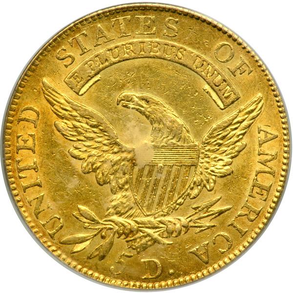 1808/7 $5 Capped Draped Bust. . BD-1, Breen-6454. Rarity-6. PCGS graded AU-50. A nice frosty coin with perhaps a few too many tiny marks on the surface to call it choice, but splendid all the same as one of the true overdates from this early period in our history. A lengthy die crack traces across the obverse from the rim above the cap across the hair curls and clasp down through the date by the first 8 and to the bottom rim.