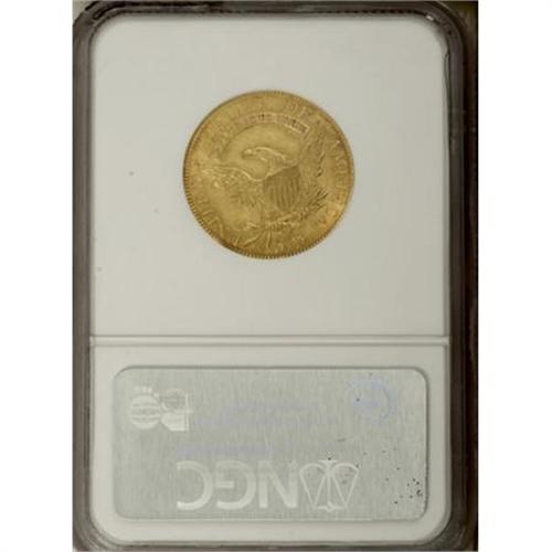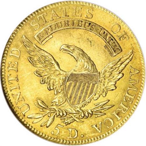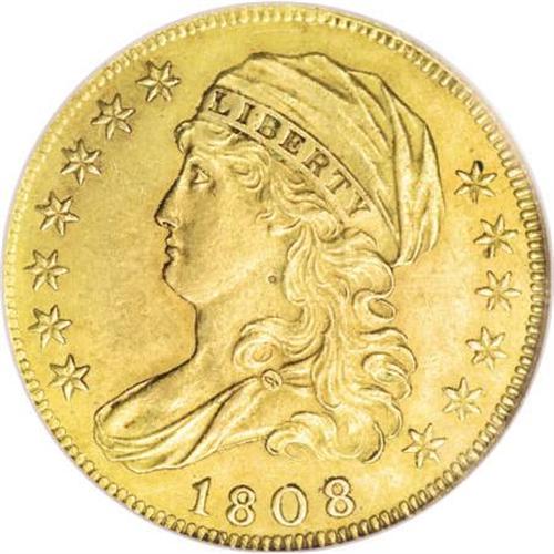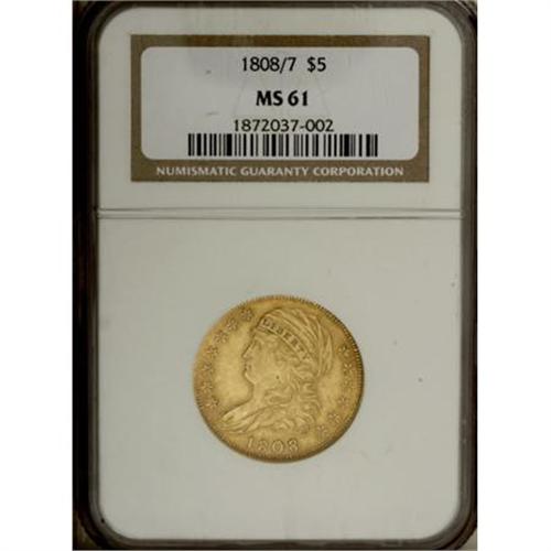 <B>1808/7 $5 MS61 NGC.</B></I> Close Date, Breen-6455, BD-2, High R.4. The upper crossbar of the 7 is obvious within the upper loop of the final 8 in the date. Part of the shaft of the 7 is also visible inside the lower left loop of the 8, and there is no sign of the 7 outside of the 8, unlike with the BD-1 that shares the same reverse die. Those enterprising numismatists who collect by die variety also look for the tiny incuse circle on the obverse center, as made and an artifact of the die's production. There are two die marriages for the 1808/7, but since BD-1 is rare, those who collect by <I>Guide Book</B></I> variety usually obtain an example of BD-2. This sun-gold piece is well defined aside from minor strike bluntness on the lower left quadrant of the eagle's neck. A thin mark reaches the middle arrowhead, but the overall appearance is blemish-free. A challenging issue, particularly when compared with its 1807 predecessor. Census: 12 in 61, 12 finer (12/07).<BR><BR><B>Coin Engraver:</B> John Reich<BR><BR><b>Shipping:</b> Coins & Currency (<a target="_blank" href="http://www.heritageauctions.com/common/shipping.php">view shipping information</a>)
