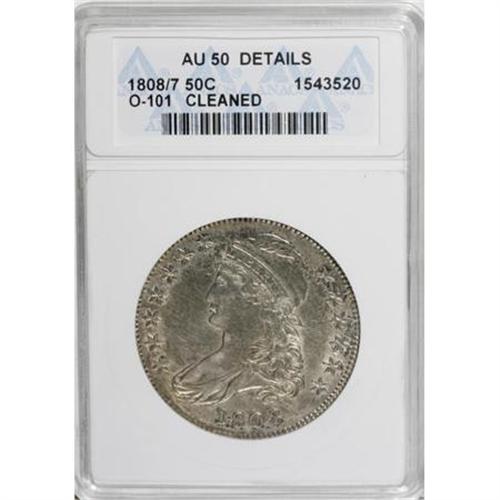 <B>1808/7 50C AU50 ANACS.</B></I> NGC Census: (9/57). PCGS Population (9/43). Numismedia Wsl. Price for NGC/PCGS coin in AU50: $625. (#6091)<BR><BR><B>Coin Engraver:</B> John Reich<BR><BR><b>Shipping:</b> Coins & Currency (<a target="_blank" href="http://www.heritageauctions.com/common/shipping.php">view shipping information</a>\)