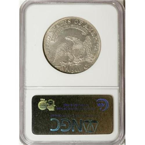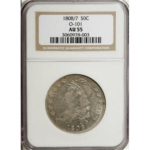 <B>1808/7 50C AU55 NGC.</B></I> O-101, R.1. The overdated variety is distinctive for the year. This modestly worn, still-lustrous piece offers predominantly silver-gray surfaces with a touch of apricot near the rims. Excellent peripheral detail, though the portrait and eagle show a degree of softness.<BR><BR><B>Coin Engraver:</B> John Reich<BR><BR><b>Shipping:</b> Coins & Currency (<a target="_blank" href="http://www.heritageauctions.com/common/shipping.php">view shipping information</a>)