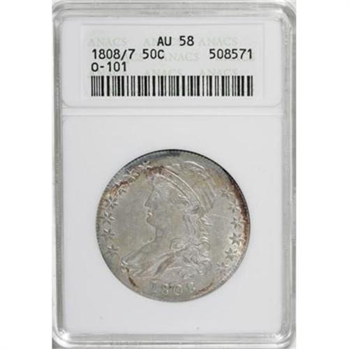 <B>1808/7 50C AU58 ANACS.</B></I> O-101, R.1. The usual die state with many peripheral cracks. The only 1808/7 die pairing. This lightly circulated half dollar is silver-gray with peripheral orange and powder-blue toning.<BR><BR><B>Coin Engraver:</B> John Reich<BR><BR><b>Shipping:</b> Coins & Currency (<a target="_blank" href="http://www.heritageauctions.com/common/shipping.php">view shipping information</a>)