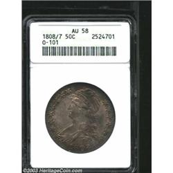 <TABLE cellSpacing=0 cellPadding=0 width="100%" bgColor=#000000 border=0><TBODY><TR><TD width="100%"><TABLE cellSpacing=1 cellPadding=3 width="100%" border=0><TBODY><TR><TD width="100%" bgColor=#79735c><FONT face=arial color=#ffffff size=3><B>Description</B> </FONT></TD></TR><TR><TD width="100%" bgColor=#ffffff><FONT face=arial size=2><B>1808/7 50C AU58 ANACS.</B></I> O-101, R.1.Lustrous light gray surfaces with deeper violet and sea-green peripheral accents. Just a touch of rub on the highpoints of the portrait precludes a Mint State designation. The die pairing is almost instantly recognized by numerous die cracks and a crystal clear overdate. </FONT></TD></TR></TBODY></TABLE></TD></TR></TBODY></TABLE><BR><A name=PricesRealized></A><TABLE cellSpacing=0 cellPadding=0 width="100%" bgColor=#000000 border=0><TBODY><TR><TD width="100%"><TABLE cellSpacing=1 cellPadding=3 width="100%" border=0><TBODY><TR><TD width="100%" bgColor=#79735c><A name=PR><FONT face=arial color=#ffffff size=3><B>Previous Prices from Heritage Auctions</B> </FONT></A></TD></TR><TR><TD bgColor=#f6f6ed><TABLE cellSpacing=0 cellPadding=0 width="100%" border=1><TBODY><TR><TD align=middle width="33%"><B>Date</B></TD><TD align=middle width="33%"><B>Service</B></TD><TD align=middle width="33%"><B>Price</B></TD></TR><TR bgColor=whitesmoke><TD width="33%"><B>05/31/2001</B></TD><TD width="33%">ANACS</TD><TD width="33%">$1,081.00</TD></TR><TR bgColor=whitesmoke><TD width="33%"><B>07/29/2003</B></TD><TD width="33%">NGC</TD><TD width="33%">$891.25</TD></TR></TBODY></TABLE></TD></TR><TR><TD bgColor=#ffffff><FONT face=arial size=1 ?>PLEASE NOTE: All prices realized reflect the final hammer price PLUS the buyer's premium in auctions that charge a buyer's premium. Each item has a notation at the top of the listing indicating whether that lot included a buyer's premium. Example: A item that sells with a final hammer price of $100 and a 20% buyer's premium will display with a price realized of $120. All information listed is intended to be as accurate as possible, but errors are possible. Please use this guide carefully and inform us of any inaccuracies. </FONT></TD></TR></TBODY></TABLE></TD></TR></TBODY></TABLE><BR><TABLE cellSpacing=0 cellPadding=0 width="100%" bgColor=#000000 border=0><TBODY><TR><TD width="100%"><TABLE cellSpacing=1 cellPadding=3 width="100%" border=0><TBODY><TR><TD width="100%" bgColor=#79735c colSpan=6><FONT face=arial color=#ffffff size=3><B>Price Guide*</B> </FONT></TD></TR><TR bgColor=#f6f6ed><TD align=middle><B>Grade</B> </TD><TD align=middle><B>Coin World<BR>(Trends)</B> </TD><TD align=middle><B>Numismedia<BR>Retail</B> </TD><TD align=middle><B>Numismedia<BR>Wholesale</B> </TD><TD align=middle><B>Coin<BR>Universe</B> </TD><TD align=middle><B>Heritage<BR>Value Index</B> </TD></TR><TR bgColor=#ffffff><TD align=middle>55</TD><TD align=right>---</TD><TD align=right>$990.00</TD><TD align=right>$825.00</TD><TD align=right>$910.00</TD><TD align=right>$835.56</TD></TR><TR style="FONT-WEIGHT: bold" bgColor=#cccfdd><TD align=middle>58</TD><TD align=right>$1,400.00</TD><TD align=right>---</TD><TD align=right>$1,150.00</TD><TD align=right>---</TD><TD align=right>$1,053.10</TD></TR><TR bgColor=#ffffff><TD align=middle>60</TD><TD align=right>$2,250.00</TD><TD align=right>---</TD><TD align=right>$2,025.00</TD><TD align=right>$1,700.00</TD><TD align=right>$1,371.67</TD></TR><TR bgColor=#ffffff><TD colSpan=6><FONT size=1>*All information listed is intended to be as accurate as possible, but errors are possible. No item may be returned or refused based on this information which is provided as a service to our customers. You should contact each pricing source directly to determine the accuracy of this information. </FONT></TD></TR></TBODY></TABLE></TD></TR></TBODY></TABLE><BR><TABLE cellSpacing=0 cellPadding=0 width="100%" bgColor=#000000 border=0><TBODY><TR><TD width="100%"><TABLE cellSpacing=1 cellPadding=3 width="100%" border=0><TBODY><TR><TD width="100%" bgColor=#79735c><FONT face=arial color=#ffffff size=3><B>Population Guide</B> </FONT></TD></TR><TR bgColor=#ffffff><TD align=middle><!-- Begin Output of Population Grid--><TABLE cellSpacing=0 cellPadding=0 width="100%" border=0><TBODY><TR><TD vAlign=center><TABLE cellSpacing=0 width="100%" border=1 cellsadding="3"><TBODY><TR><TD vAlign=center><TABLE cellSpacing=0 cellPadding=3 width="100%" border=1><TBODY><TR><TD vAlign=center align=middle bgColor=#f0f1e8 colSpan=2 <CENTER><FONT face=Arial size=2><B>PCGS Pop </B></FONT><CENTER></CENTER></TD><TD vAlign=center align=middle bgColor=#f0f1e8 colSpan=2><CENTER><FONT face=Arial size=2><B>NGC Pop</B></CENTER></FONT></TD></TR><TR><TD vAlign=center><FONT face=Arial size=2>(58)</FONT> </TD><TD vAlign=center align=right><FONT face=Arial size=2>3</FONT> </TD><TD vAlign=center><FONT face=Arial size=2>(58)</FONT> </TD><TD vAlign=center align=right><FONT face=Arial size=2>11</FONT> </TD></TR><TR><TD vAlign=center><FONT face=Arial size=2>(>58)</FONT> </TD><TD vAlign=center align=right><FONT face=Arial size=2>11</FONT> </TD><TD vAlign=center><FONT face=Arial size=2>(>58)</FONT> </TD><TD vAlign=center align=right><FONT face=Arial size=2>12</FONT> </TD></TR></TBODY></TABLE></TD></TR></TBODY></TABLE></TD></TR></TBODY></TABLE><!-- End Output of Population Grid--> Important notice: Heritage usually auctions material at the rate of 200-250 lots per hour. On some occasions eBay Live bid software or the Internet may not be able to keep up with the pace of the auction. We recommend placing a realistic absentee bid now as insurance to avoid disappointment. Occasionally the auctioneer may eliminate or reject an eBay Live bid, and the auctioneer may also reopen a lot after the close of the eBay live bidding (usually because we missed an audience bid), and may reject your bid even if it shows you as the winning bidder. By bidding via eBay Live, you agree that Heritage may award the lot to another bidder at its sole discretion under the circumstances descri