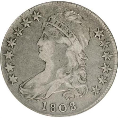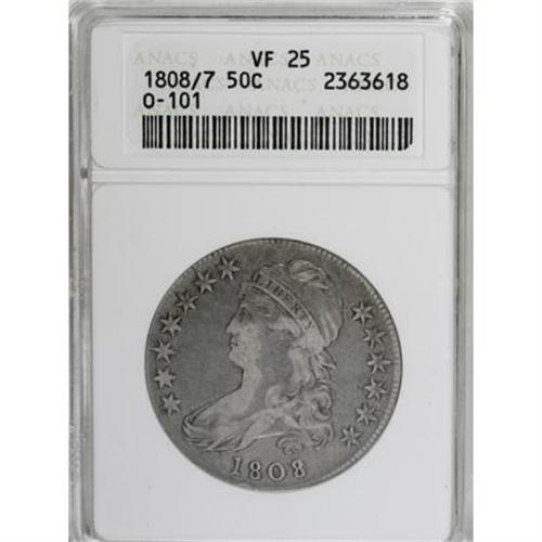 <B>1808/7 50C VF25 ANACS.</B></I> O-101. NGC Census: (3/110). PCGS Population (5/94). Numismedia Wsl. Price for NGC/PCGS coin in VF25: $239. (#6091)<BR><BR><B>Coin Engraver:</B> John Reich<BR><BR><b>Shipping:</b> Coins & Currency (<a target="_blank" href="http://www.heritageauctions.com/common/shipping.php">view shipping information</a>)
