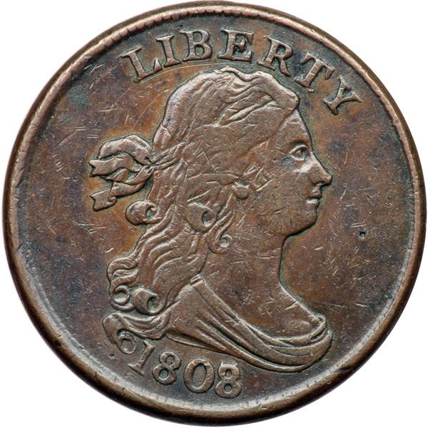1808/7 C-2 Overdate 8 over 7 VF25. Slightly sharper with a few light contact marks, all blended perfectly into the glossy chocolate and medium brown toning. There are a couple small puffs of darker olive brown toning on both sides. The surfaces are smooth except for a small spot of fine carbon dust near the dentils behind the head. The notable marks are a small pinprick in the field off the chin and a light hairline scratch under LIBE. Excellent eye appeal for the grade and the overdate feature is bold. EDS, Manley state 1.0, without any trace of a die crack at TY. The fields on both sides are smooth and slightly reflective. Davy #08.2.9.